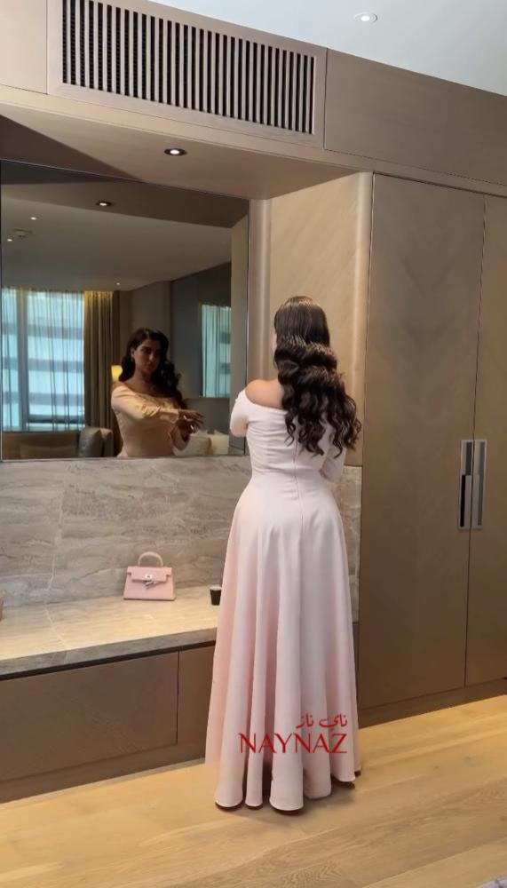 فستان وردي فاتح يمنحه لمسة ناعمة وأنثوية طويل يمتد حتى الأرض مع اتساع تدريجي من الخصر إلى الأسفل مما يعطيه انسيابية ورقياً والأكمام طويلة وضيّقة نسبياً، ما يضيف لمسة كلاسيكية محتشمة والياقة أوف شولدر مع لمسة دانتيل رقيقة على خط الصدر، تضفي أنوثة ورقي.