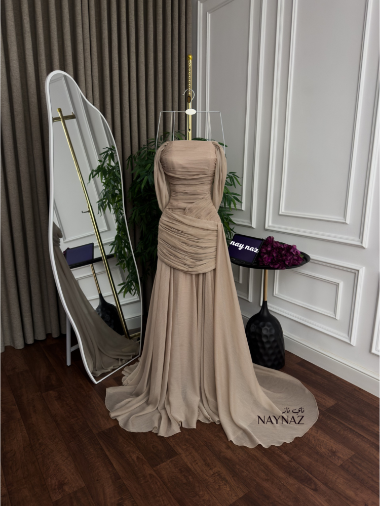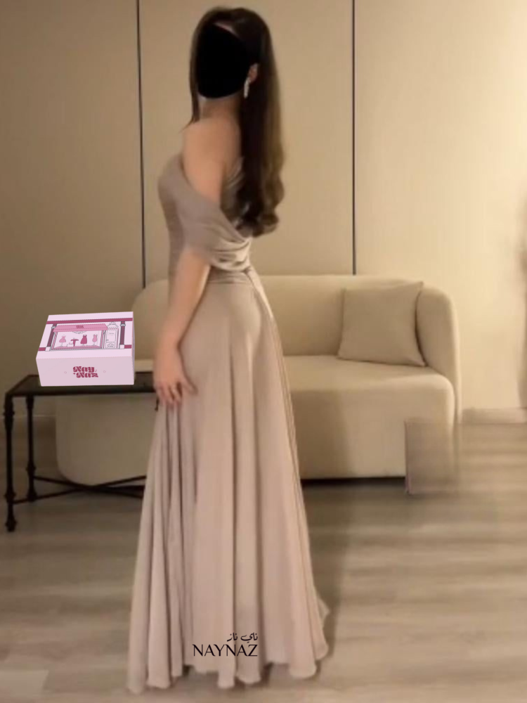 فستان سهرة فخم ناي ناز كلمسة ضوء على الحرير، يأتي هذا الفستان بلونه البيج الهادئ ليجسّد الرقيّ في أنقى صوره.