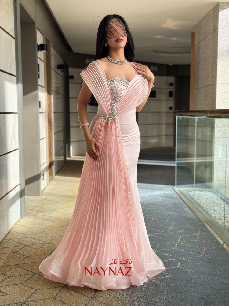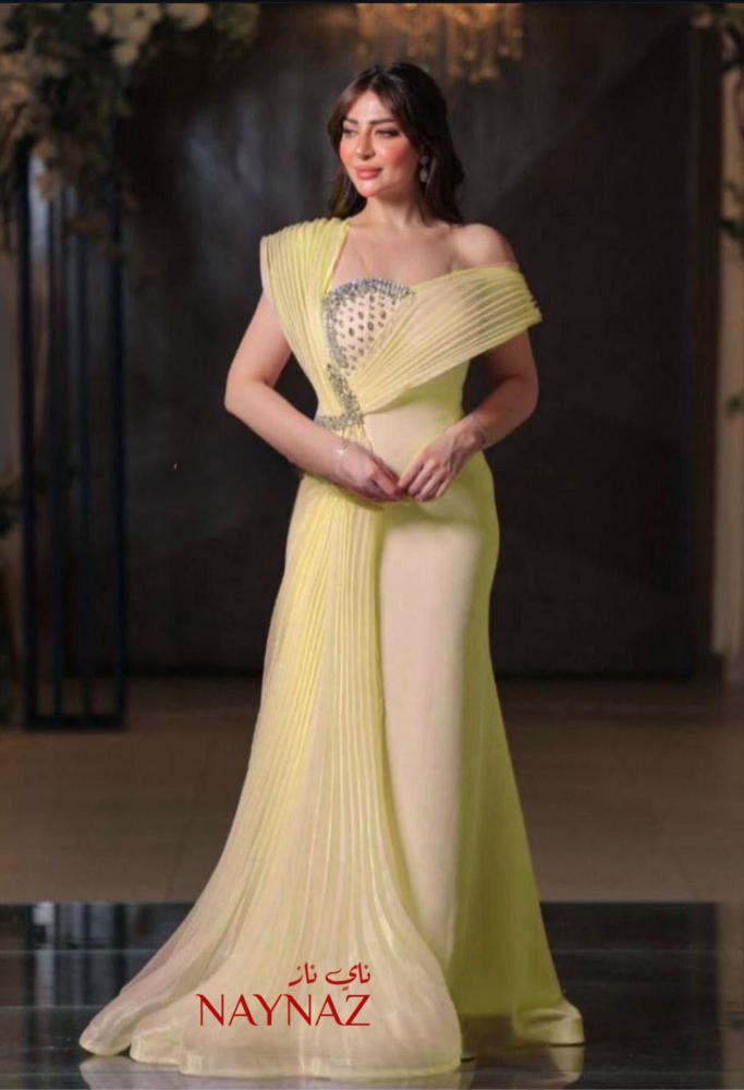 فستان قَصّة طويل وانسيابي، يمتد بشكل مستقيم مع اتساع بسيط من الأسفل ليمنح حرية حركة ورشاقة. مصنوع من خامة خفيفة شفافة بطبقات ناعمة، ما يعطيه مظهرًا انسيابيًا ورومانسيًا والجزء العلوي مزين بكريستالات وأحجار لامعة باللون الفضي تغطي منطقة الصدر، مرتبة بطريقة أنيقة تلفت الانتباه والأكتاف التصميم أوف شولدر مع طبقة قماش شفافة مطوية بشكل فني لتشكل كتفين عريضين ينسابان بانسيابية.ومصمم من شريط طويل من القماش نفسه يبدأ من الخصر ويتدلى بشكل ناعم على طول الفستان، مما يضيف لمسة رقيقة وانسيابية.