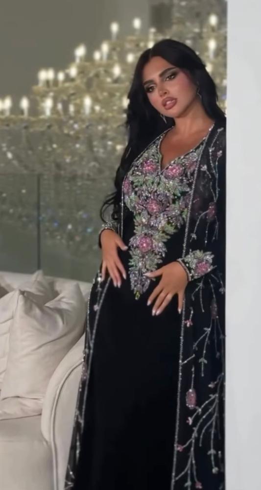 الأقمشة الشفافة المستخدمة في بعض الأجزاء تضيف لمسة أنثوية ناعمة يتميز القفطان بتطريز يدوي فخم جدًا على كامل الصدر والأكمام، إضافة إلى امتداده عموديًا على طول القماش التطريز منسوج بخيوط ذهبية وفضية فاتحة تتداخل مع ألوان الوردي الفاتح والأخضر الزمردي لتشكيل زخارف زهرية دقيقة، تشبه أغصان الورود الناعمة الأحجار والكريستالات الصغيرة المضافة تمنحه بريقًا راقيًا وملمسًا ثريًا، خصوصًا في الإضاءة القفطان بقصّة كلاسيكية طويلة مع فتحات على الأكتاف (كتف مكشوف جزئيًا) تمنحه لمسة عصرية وجاذبية راقية الحواف مزينة بخط من الكريستال الفضي اللامع يمتد على طول الأطراف والياقة، مما يحدد القفطان بشكل جميل الأكمام طويلة وواسعة قليلًا من الأسفل، مما يضيف فخامة وانسيابية عند الحركة.